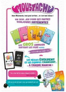 Moustache, c’est bien plus qu’un simple jeu de plis : c’est un concentré de stratégie, de chaos organisé et de surprises en cascade ! Ici, rien n’est figé : les équipes changent à chaque manche, les alliances se font et se défont, et de nouvelles règles viennent s’ajouter progressivement, transformant la partie au fil du temps. Chaque manche devient un mini-défi où il faut lire le jeu de ses adversaires… mais aussi de ses alliés temporaires.